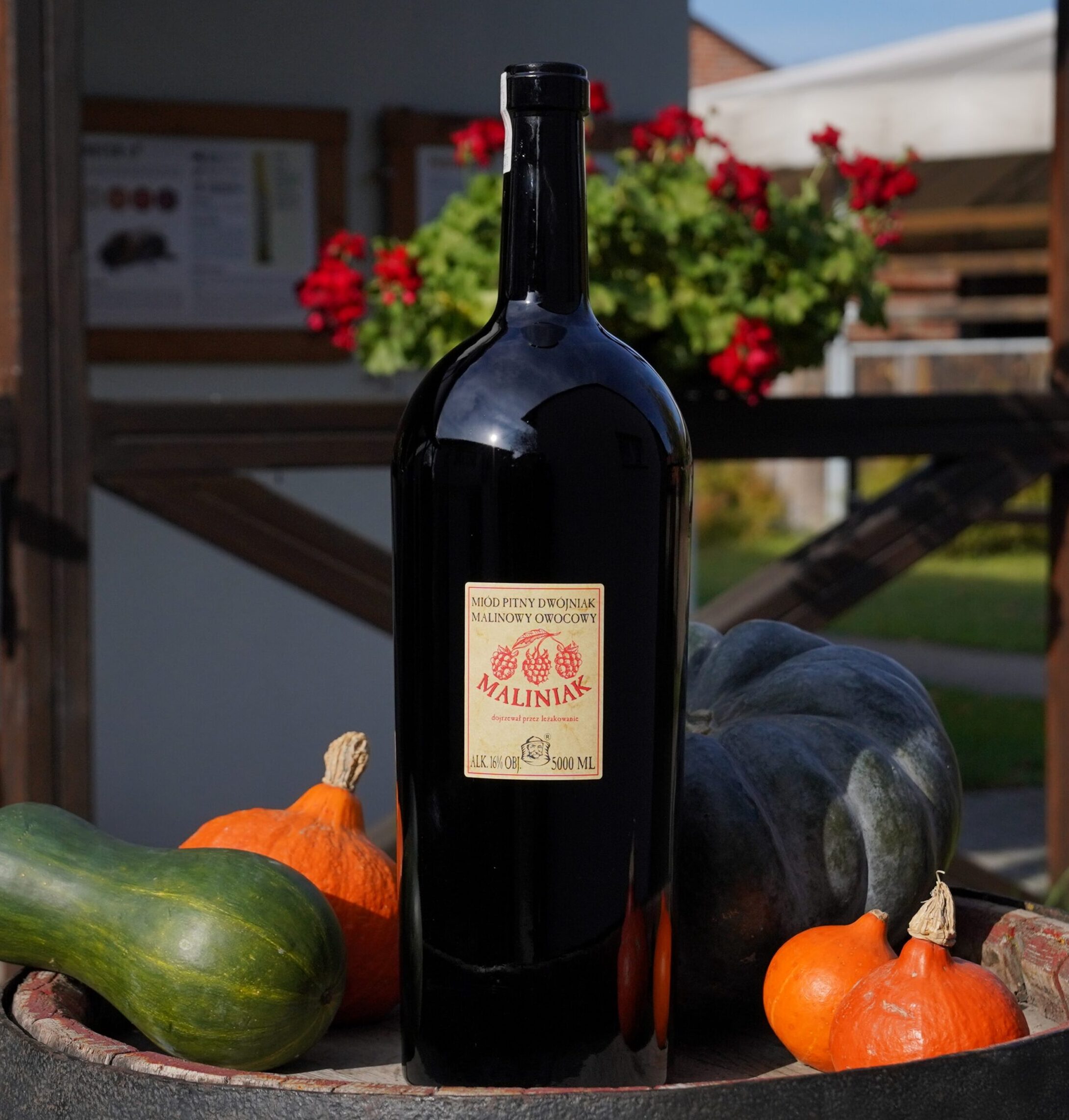 Dwójniak Maliniak – Jest miodem pitnym owocowym, w którym minimum 30% wody potrzebnej do produkcji zostało zastąpione sokiem malinowym. Wytworzony z najlepszej jakości miodów wielokwiatowych. Dojrzewa przez leżakowanie. Rozlewany jest do butelek kamionkowych jak i do butelek szklanych. Zawartość alkoholu ok. 15%. Ma niezwykłe stężenie aromatu, choć nie jest przesadnie owocowy. Swój wyborny smak zawdzięcza równowadze garbnikowo – kwasowej i odrobinie miodowej goryczy. Zawiera duże ilości naturalnych przeciwutleniaczy.